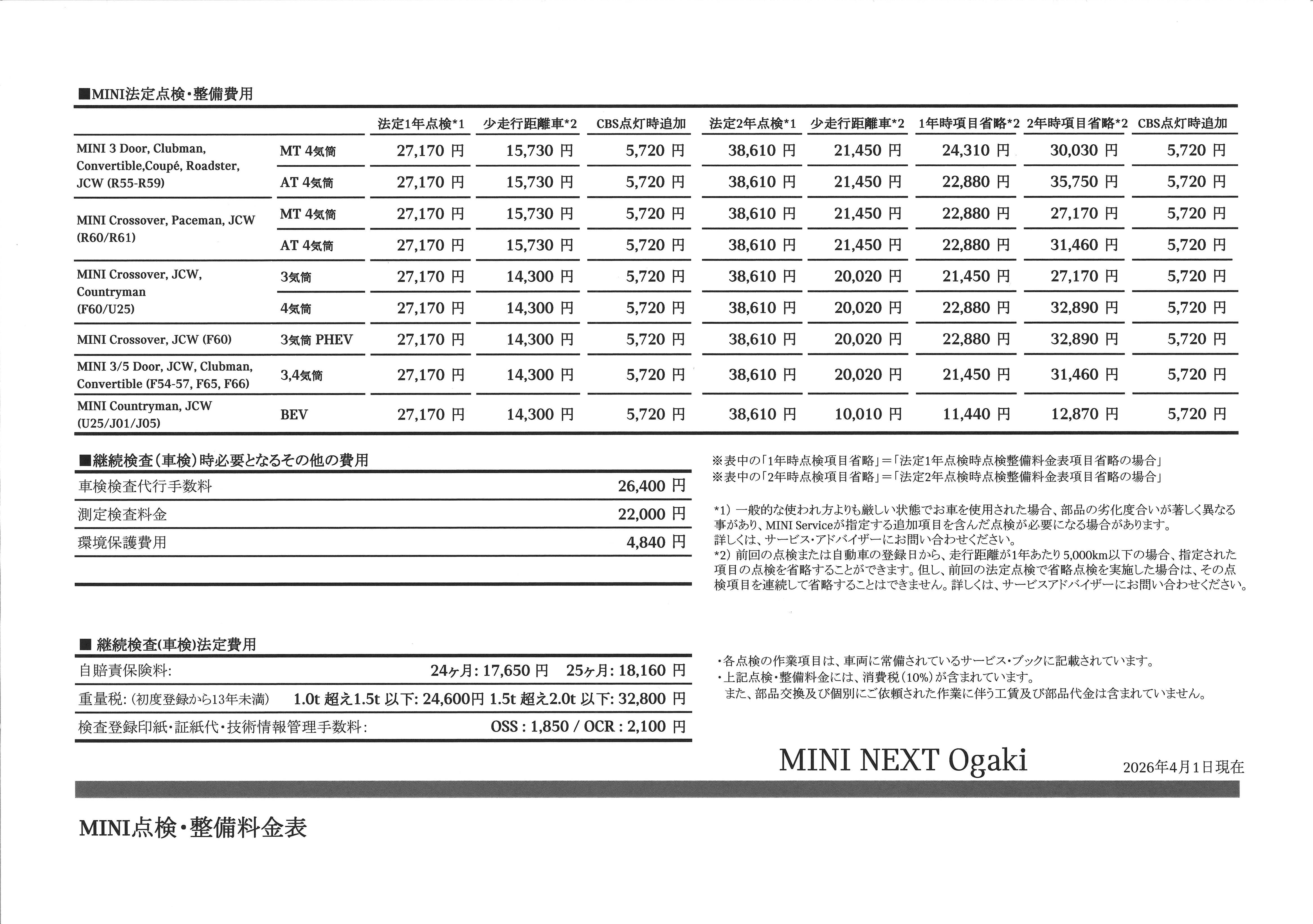 ※2026年4月1日現在の料金表です。